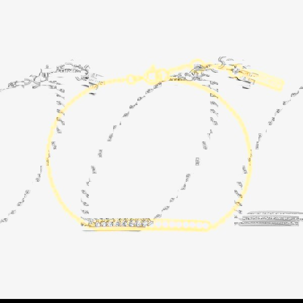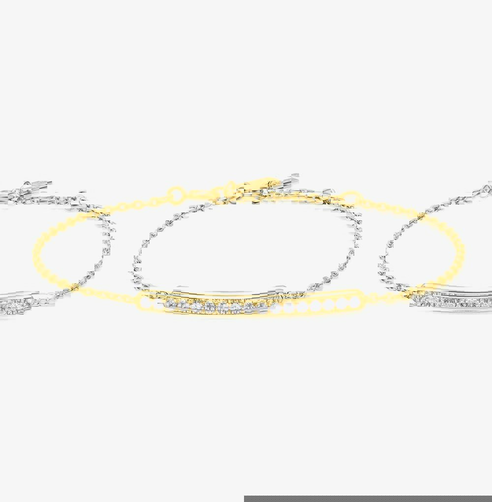 Elegant and effortlessly refined, the Vogue Maven bracelet is made for those who appreciate subtle luxury. Featuring a sleek bar adorned with a row of sparkling cubic zirconia, this piece embodies bold minimalism. Crafted from 925 sterling silver with 14ct gold plating, it's perfect worn alone or stacked for a modern layered style.