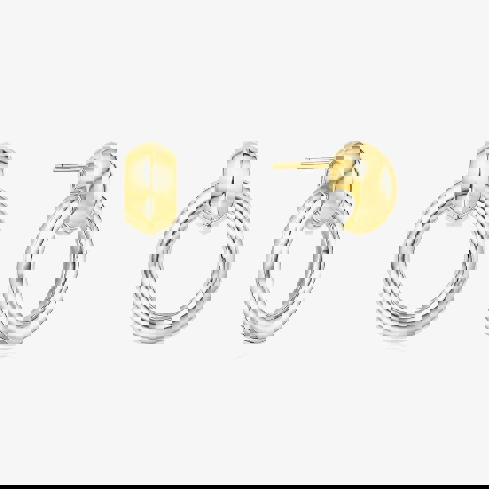 From the Vogue Maven collection, these elegant earrings feature a modern two-tone design crafted from sterling silver with contrasting plated finishes. Styled as studs with a sleek hoop dropper detail, they blend classic form with contemporary flair, perfect for adding a refined touch to both everyday and elevated looks.