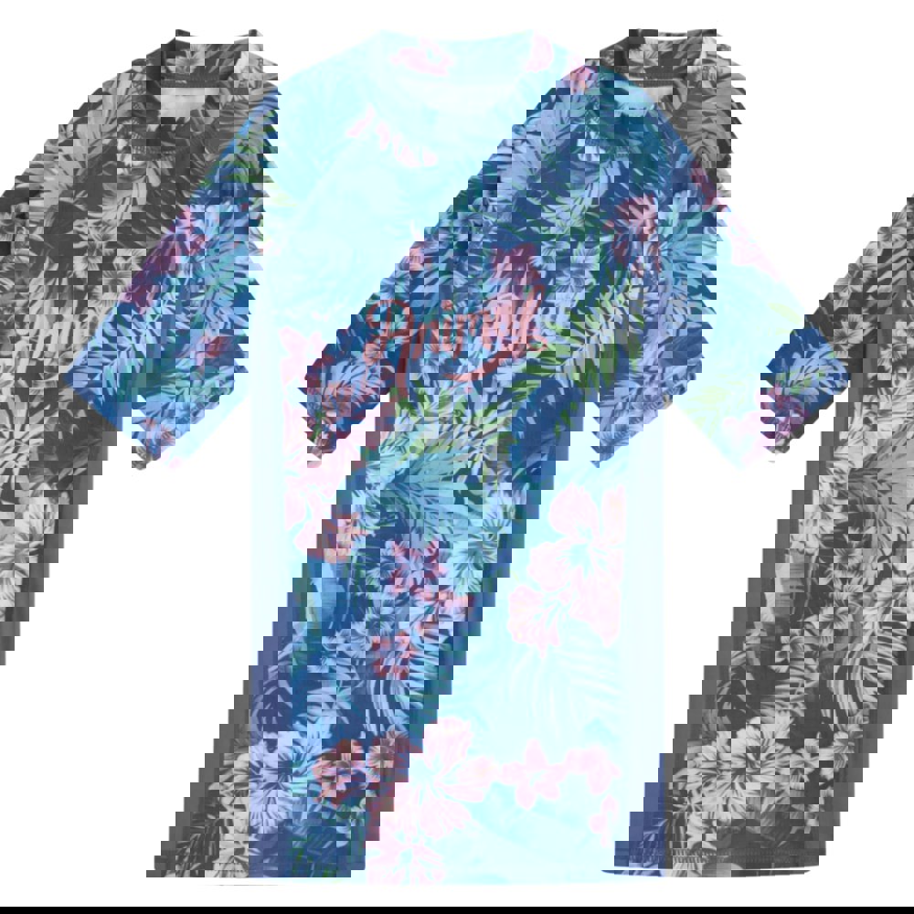 Animal Kids Daisy rash top in purple with a printed design of flowers, leaves and logo. Made from 85% recycled polyester and 15% elastane, with a crew neck and pull-over fastening. Durable, quick-dry fabric technology and flatlock stitching.