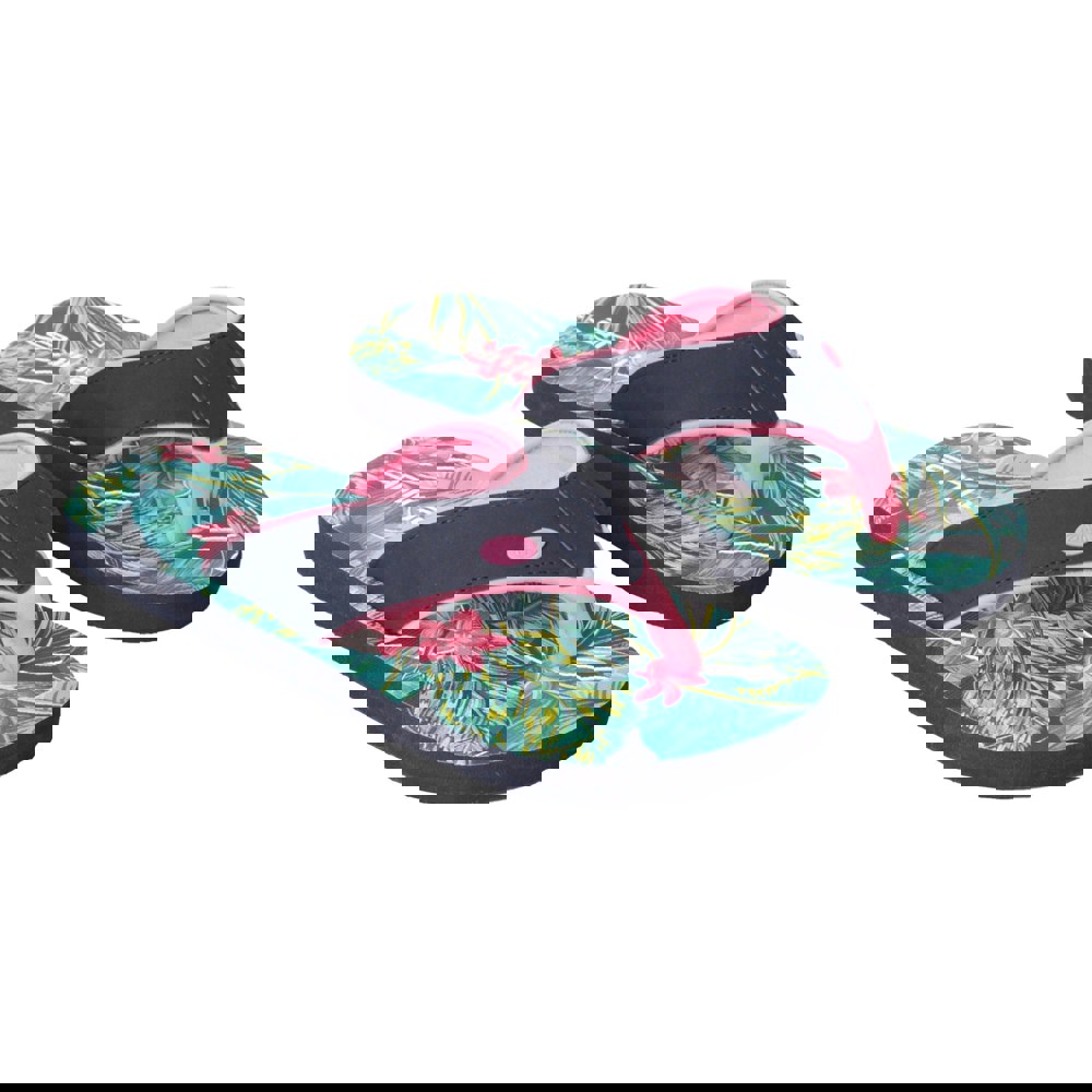 These Animal Kids Swish flip flops come in green with a tropical leaves design, finished with contrast details, flowers and a logo. The open-toe, toe-post construction is paired with a wide strap and an open heel. A flat heel and slip-in fastening keep the shape simple and easy to wear.