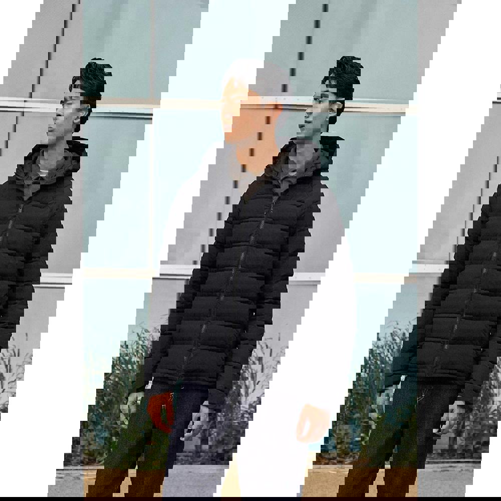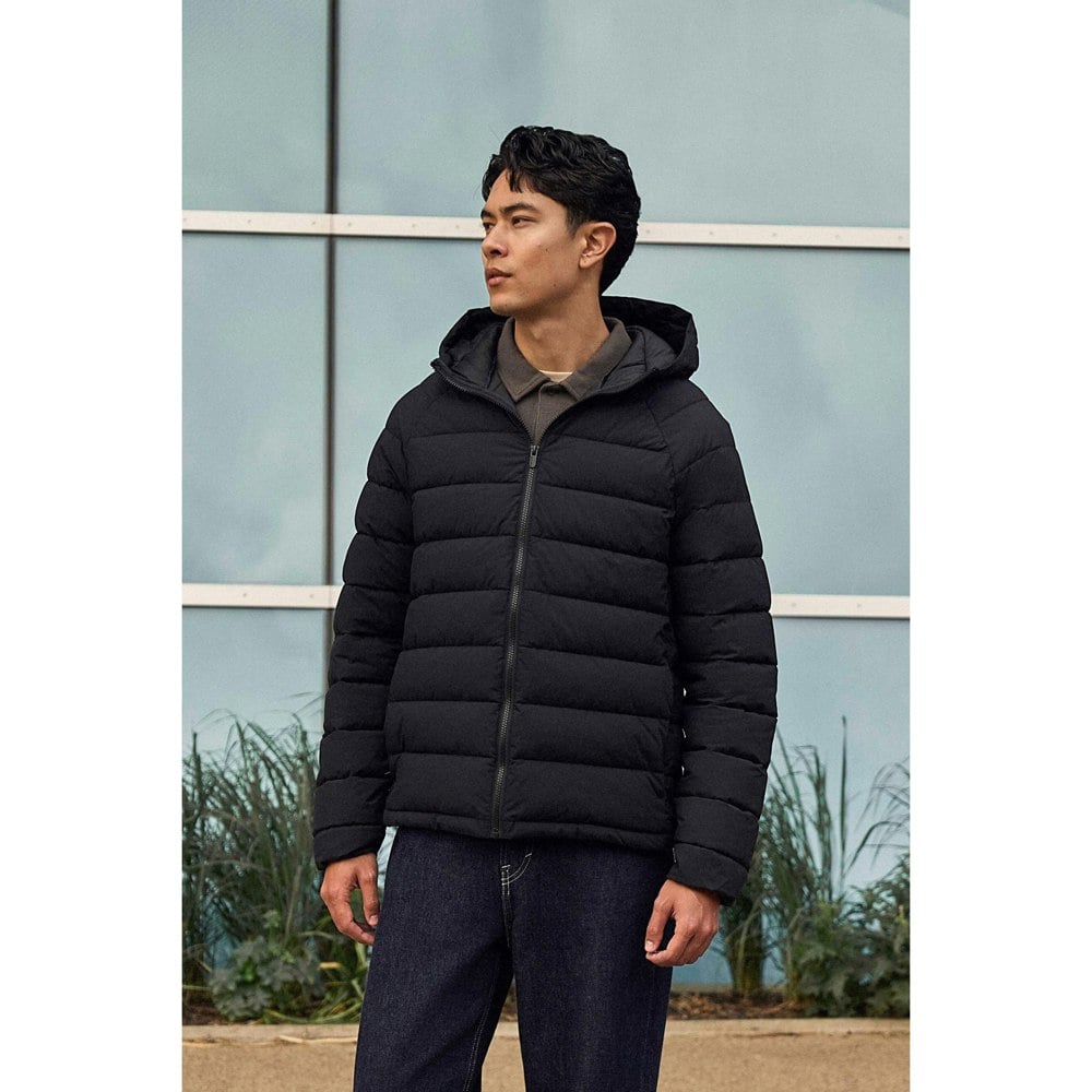 This men’s Cloud Cosi Light padded jacket comes in black with a plain, quilted finish. The outer is made from 100% polyamide, with a polyamide and polyester lining and a 100% polyester filling in faux down microfibre. A hooded neckline and long, padded sleeves give it a practical, insulated construction for colder conditions.