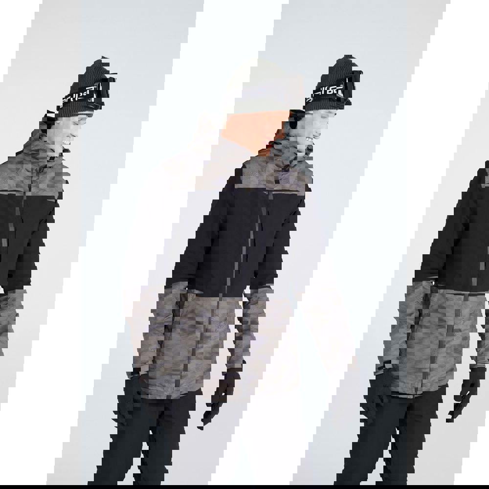 Abstract printed panels sit alongside contrast detailing and logo elements. Practical features include a full zip fastening with a branded zip pull, plus ventilation and an integrated snowskirt. Storage is arranged across the body and sleeve, including a dedicated ski pass pocket. The fabric is breathable and treated with a durable water repellent (DWR) finish, with a waterproof rating/weight of 5000mm / 5000g/m²/24hrs.
