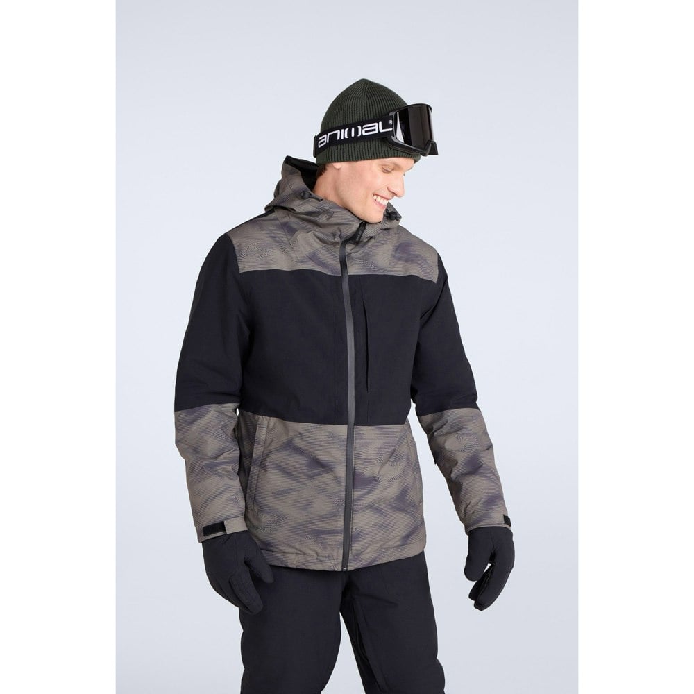 The Animal Mens Cruise snowboarding jacket in khaki brown is built with a recycled polyester-blend outer and a polyester lining, finished with 100% recycled polyester filling. Elastane and polyamide are also listed in the material composition. The hooded neckline and long sleeves create full coverage, with adjustable cuffs for a secure feel.