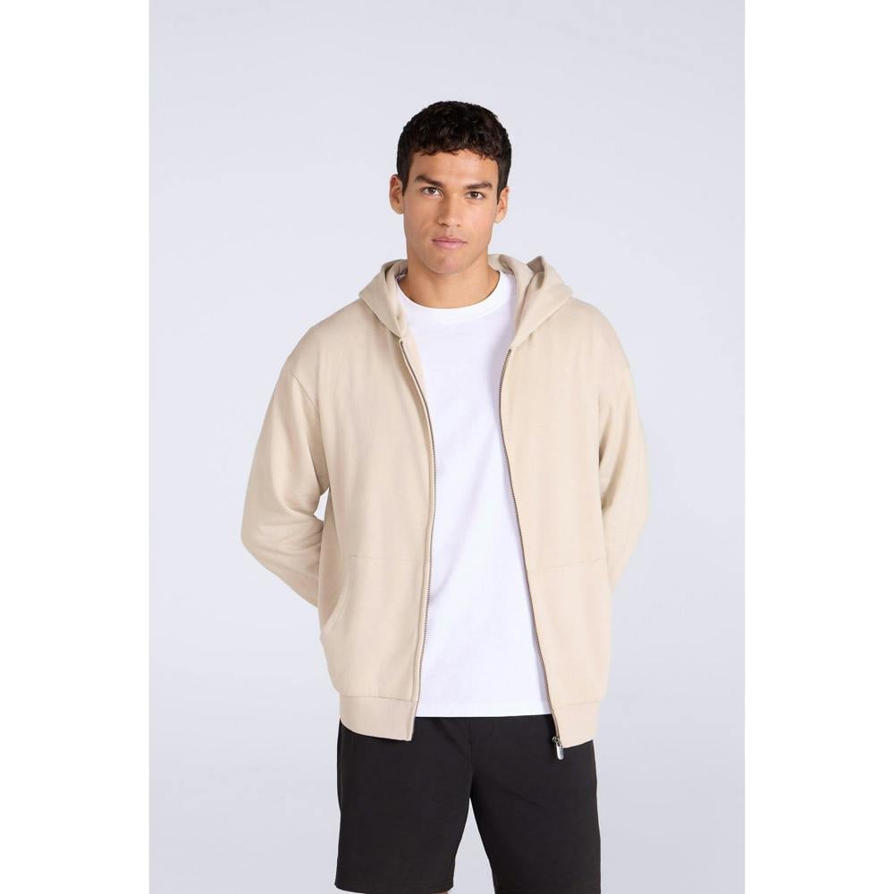 This full zip hoodie is made from cotton with a soft-touch fabric finish. It comes in beige with a plain design and an icon logo detail. The hooded neckline includes an adjustable hood, while the long sleeves are finished with elasticated cuffs. An elasticated hem completes the snug fit.