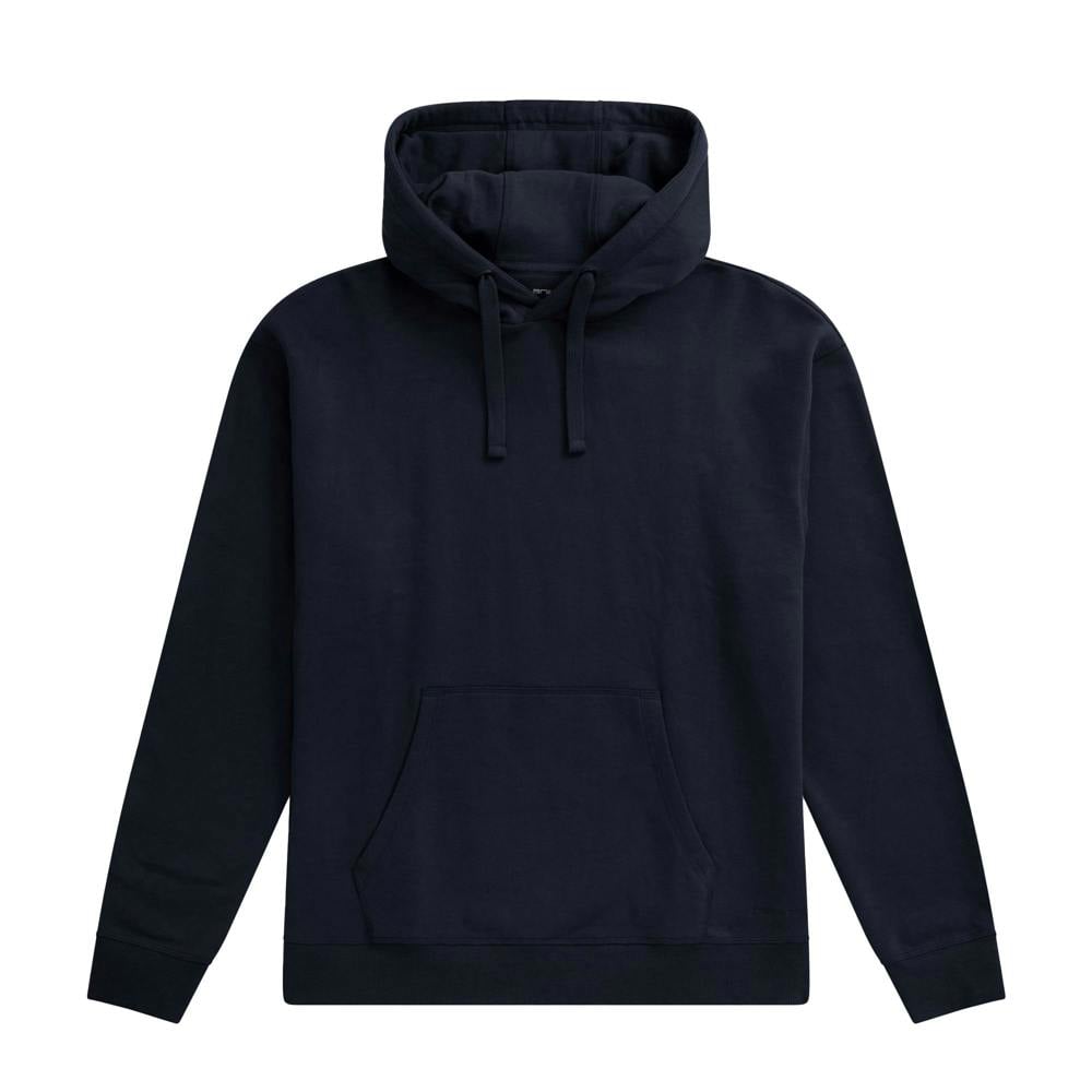 This men’s hoodie is made from organic cotton with added elastane and finished in a plain navy colourway. A hooded neckline with an adjustable drawcord and sew-on hood construction keeps the look clean and practical, while the pull-over fastening maintains a simple, everyday shape.