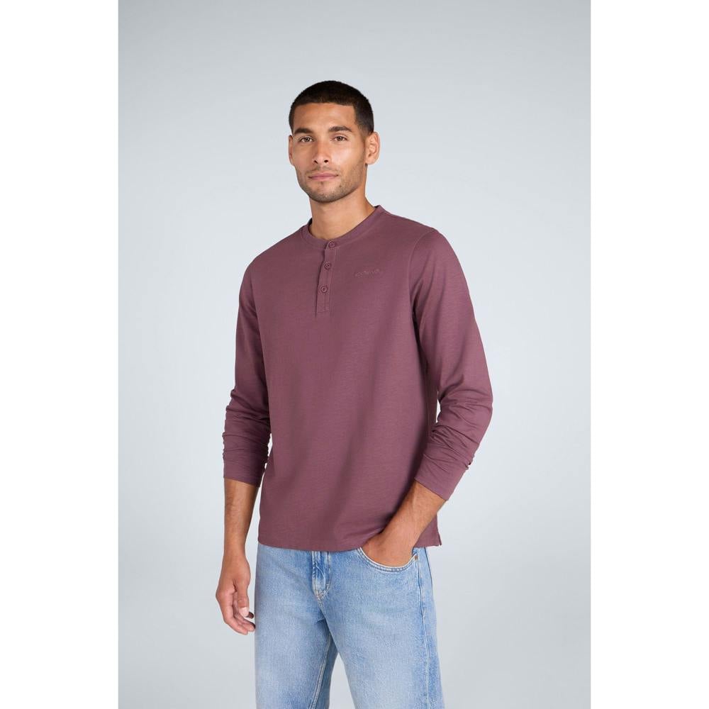 This men’s Noah Henley T-shirt comes in dark purple with a plain finish and embroidered logo detail. Made from organic cotton with added elastane, it has a lightweight feel and a long-sleeved silhouette. The Henley neckline is finished with a three-button placket and button fastening for a clean, practical front detail.