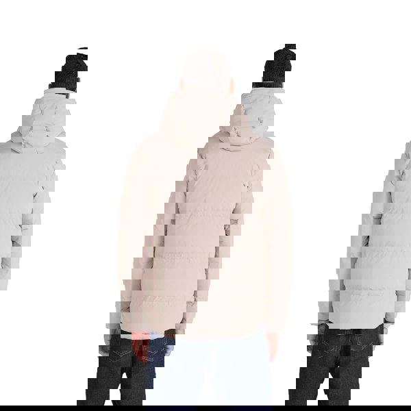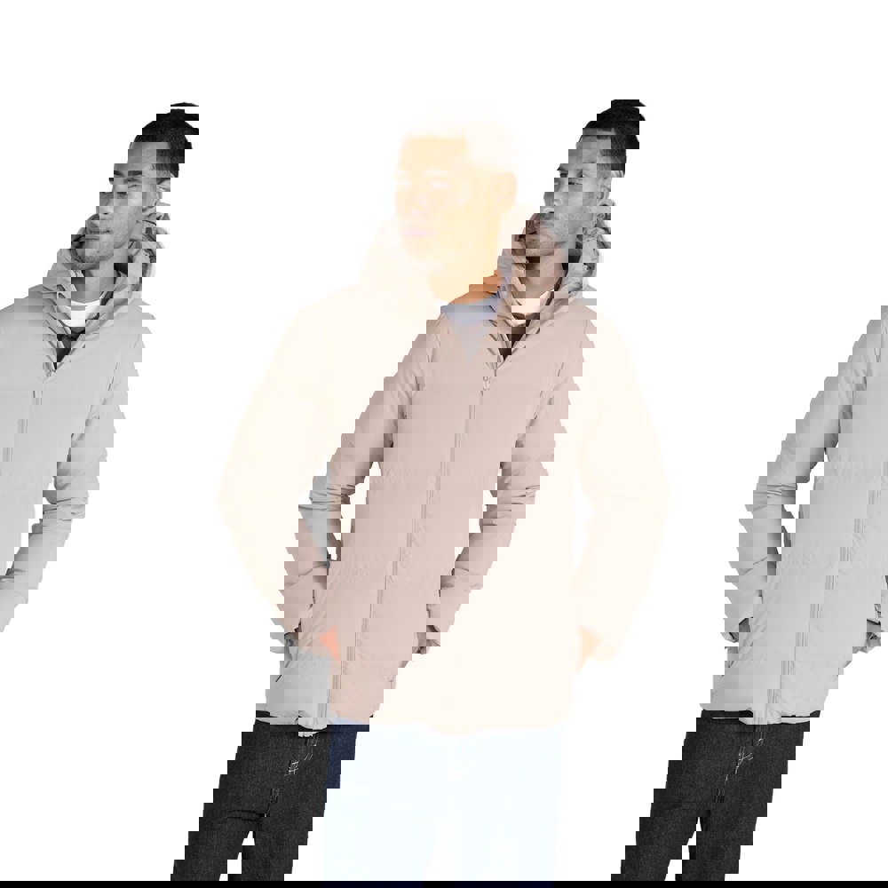 This men’s tech down jacket comes in beige with a logo design and a hooded neckline. It has long sleeves and a full zip fastening for straightforward layering in cooler conditions. Two side pockets provide practical storage, while an adjustable hem allows the shape to be altered as needed.