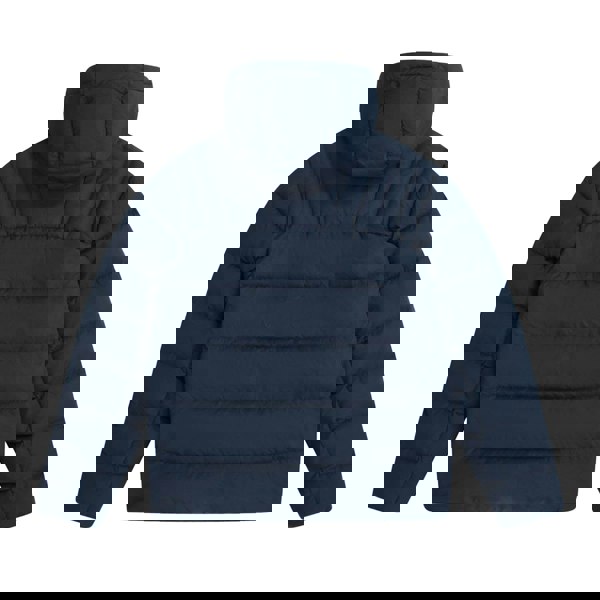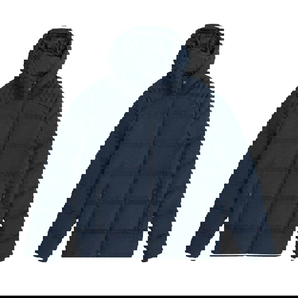 This midweight tech down jacket comes in navy with a logo design and a hooded neckline. An adjustable hood and long sleeves create a practical outer layer for cooler conditions, while heat sealed baffles form a clean, structured finish. The jacket fastens with a full zip and includes two side zip pockets for secure storage.