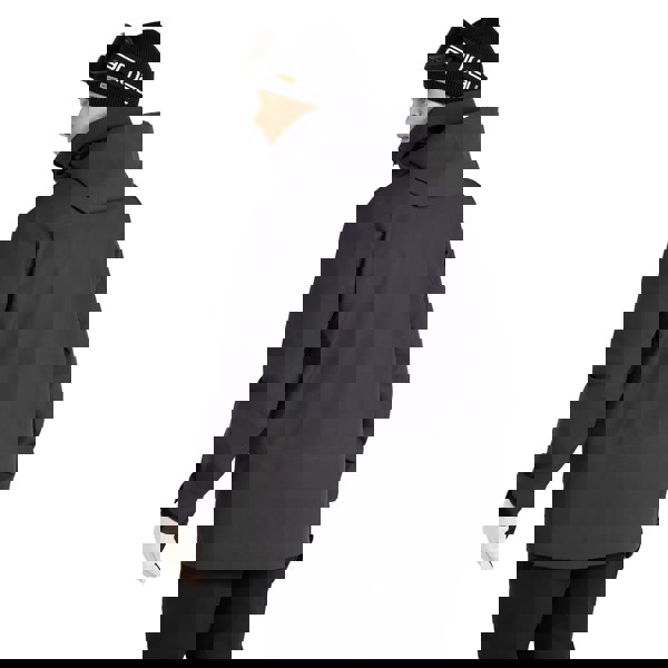 A full zip fastening keeps the front clean and practical, while the hooded neckline includes a hidden hood with a zip-off design and toggle adjuster. Long sleeves are finished with adjustable cuffs and touch fastening tabs. Storage is provided by two side pockets and a sleeve pocket, with added details including a decorative zip and a detachable snowskirt.