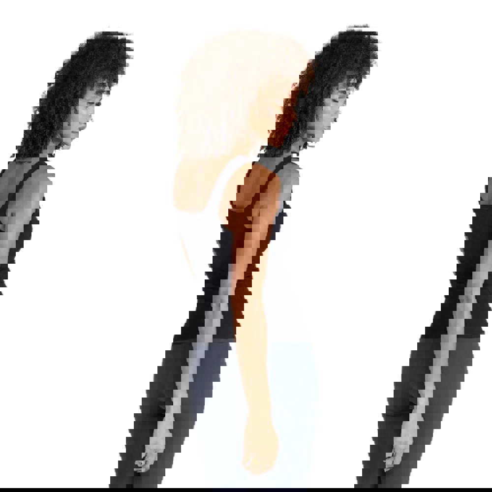 This women’s active ribbed vest top comes in black with a plain finish and a sleeveless cut. It has a square neckline and a square back, creating a clean, structured shape that works well for training and everyday activewear.