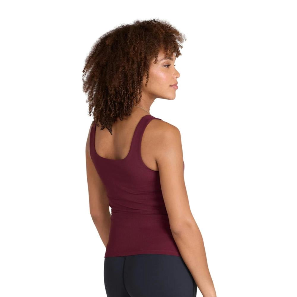 This women’s active ribbed vest top comes in burgundy with a plain design and a sleeveless cut. It has a square neckline and a square back, creating a clean, structured shape suitable for active wear.