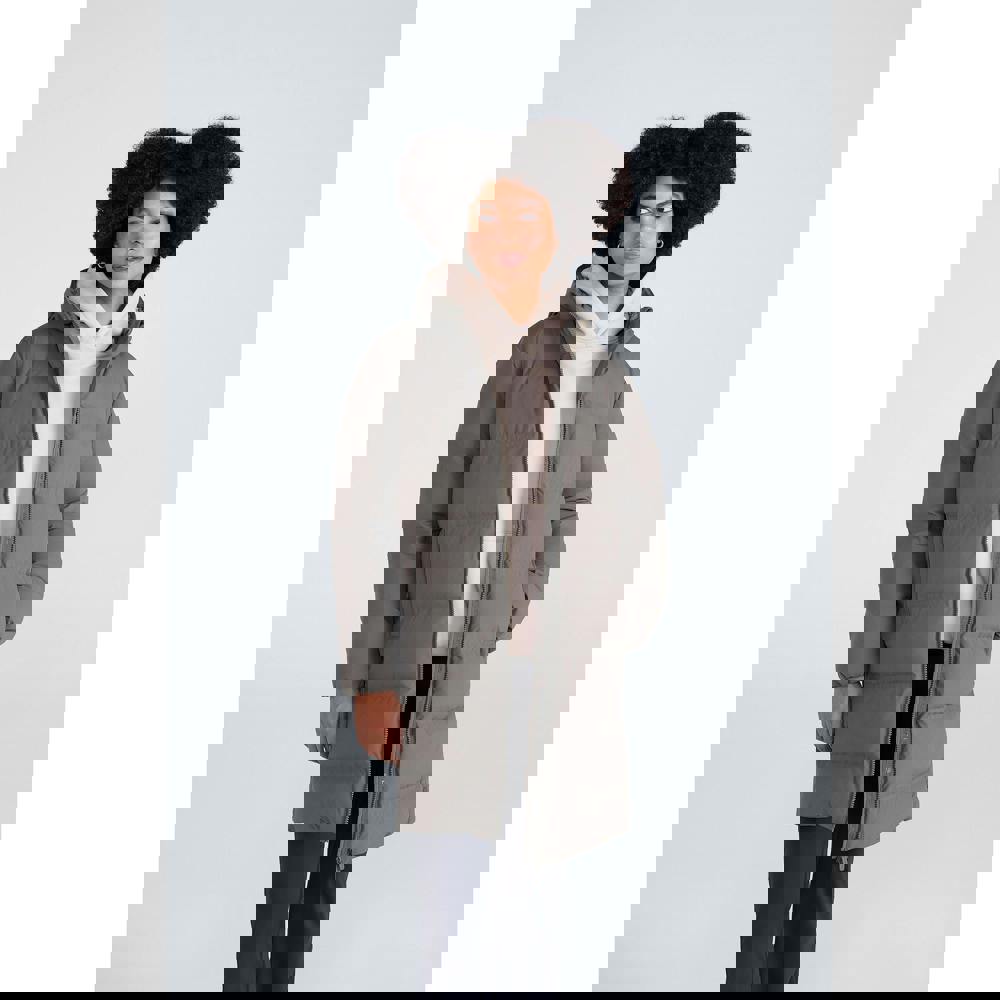 The Animal Cosi Cloud down coat comes in khaki green with a plain finish and a mid-length cut. It has a hooded neckline, long sleeves and a two way zip fastening for straightforward wear. The outer is made from 100% polyester with a 100% polyamide lining.