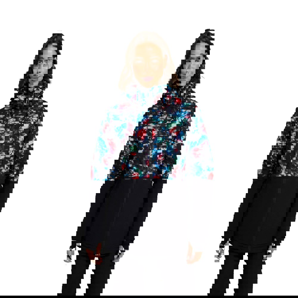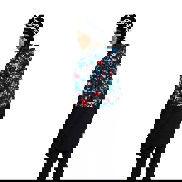 This women’s ski jacket is made from a blend of elastane, polyamide, polyester and recycled polyester. It has a coral base with contrast detailing, a graphic print and logo, finished with a rubber badge. The hooded neckline and long sleeves create a practical outer layer for time on the slopes.