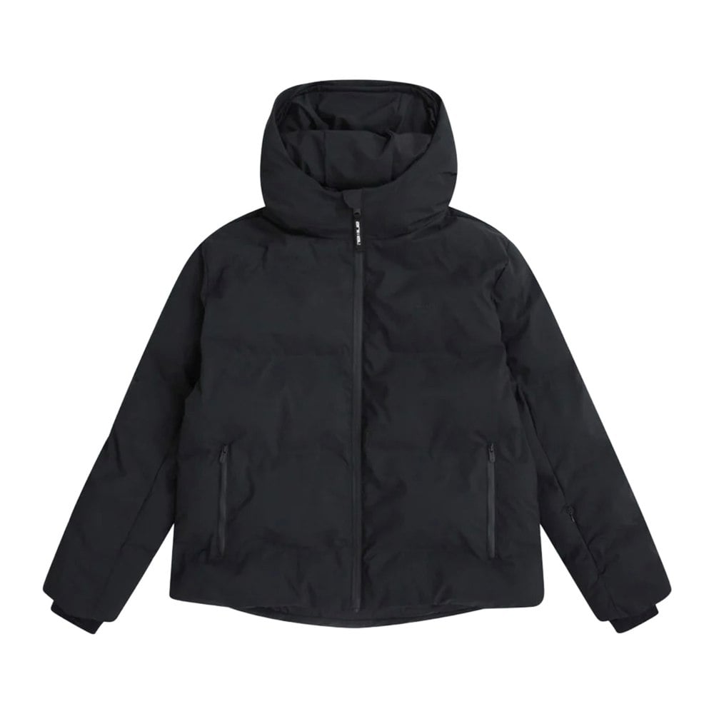 This women’s Glacier ski jacket is made from 100% polyester and finished in black with a tonal logo. It has a hooded neckline and long sleeves, with a full zip fastening through the front. Heat-sealed baffles form part of the construction, alongside a detachable snowskirt for added coverage.
