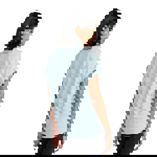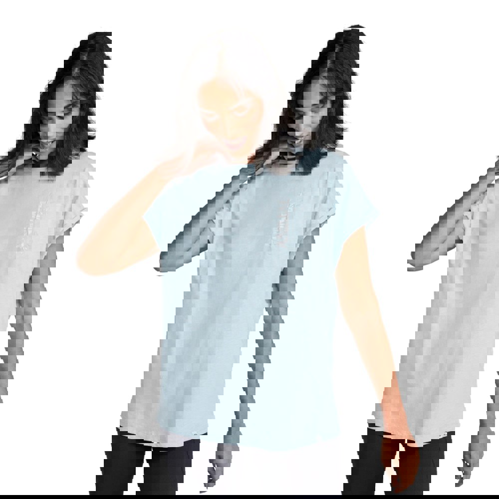 Animal Womens Holly Logo T-Shirt in light blue is made from 100% cotton. It has a crew neck and short sleeves, finished with a turned-up cuff. The design combines a plain base with printed logo detailing for a clean, casual look.