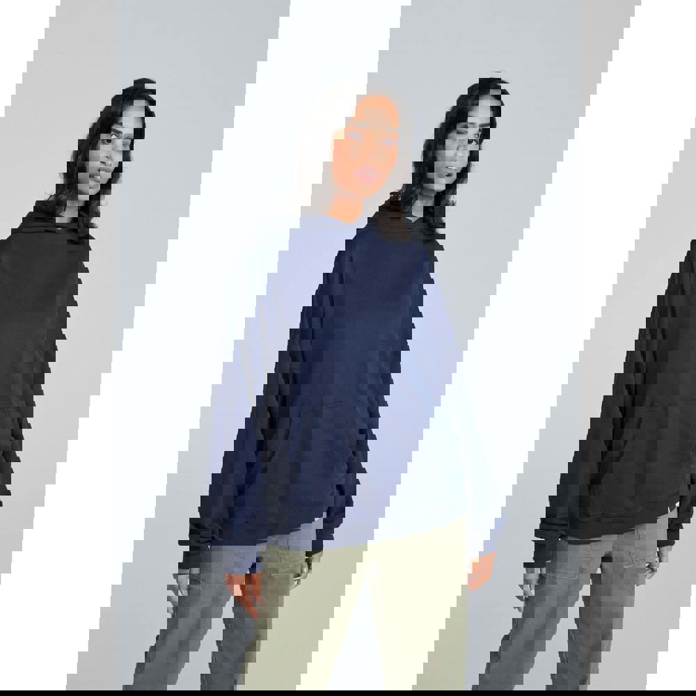 This women’s hoodie comes in dark blue with a plain finish and logo detail. Made from organic cotton and elastane, it has a brushed back and soft-touch feel. The hooded neckline is finished with a sew-on hood, while the drop-shoulder, long-sleeved shape keeps the look relaxed and easy to layer.