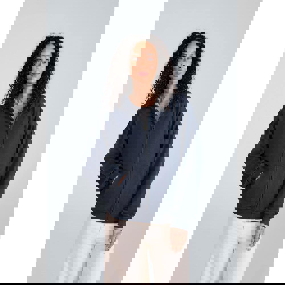 It has a sew-on hood with a hooded neckline, long sleeves, and elasticated cuffs and hem. A full zip fastening and two side pockets complete the practical, everyday shape.