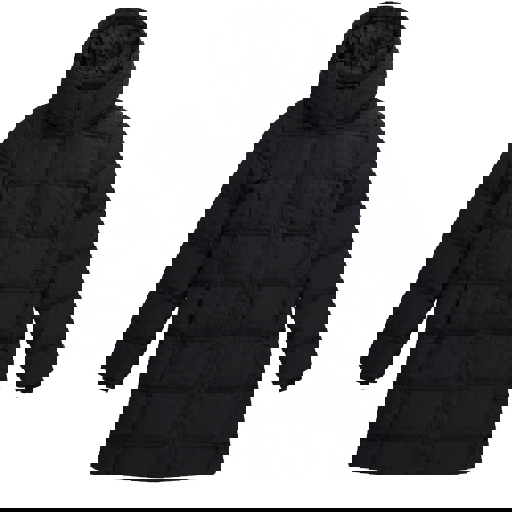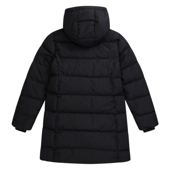 The Animal Womens Ivy Down Coat in jet black is a longline, hooded style with long sleeves and a plain finish with logo detailing. The shell combines polyester and elastane, with a 100% polyester lining and downproof construction. Insulation uses 80% grey duck down and 20% grey duck feather, with feather power fill 600.