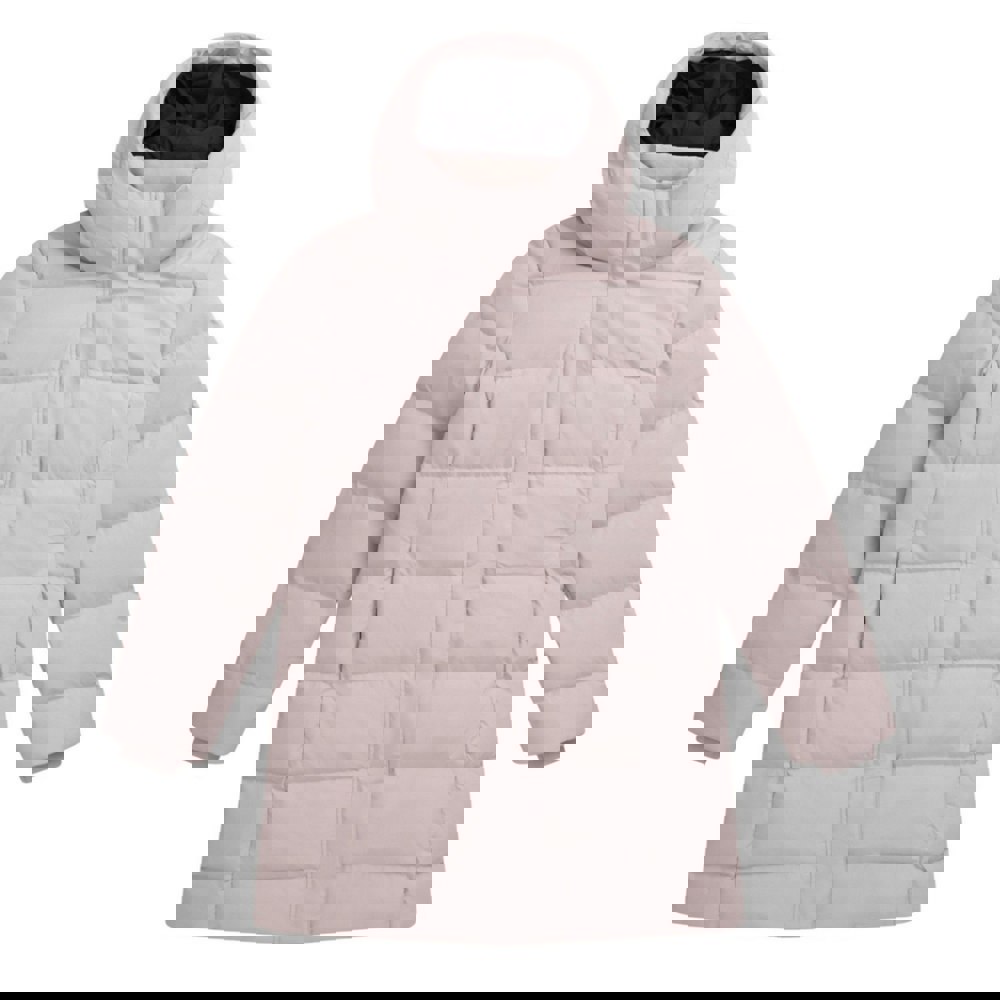This longline down coat combines a plain finish with logo detailing in a light beige colourway. The shell is made from elastane and polyester, with a downproof lining in 100% polyester. Insulation comes from an 80% grey duck down and 20% grey duck feather fill, with feather power fill 600 stated.