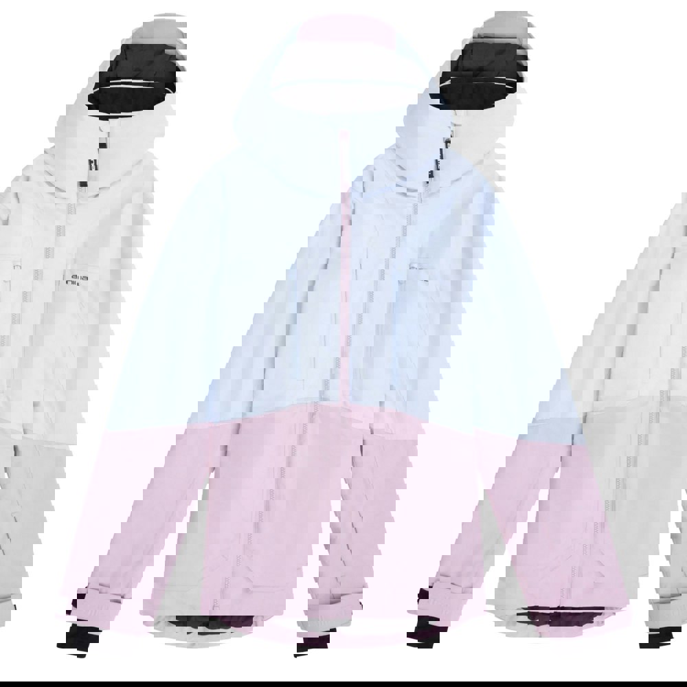 This women’s ski jacket is made from 100% polyester and finished in pale blue with contrast panelling and a logo detail. A hooded neckline and long sleeves create a practical outer layer for on-slope wear, while a full zip fastening keeps the front clean and easy to secure.
