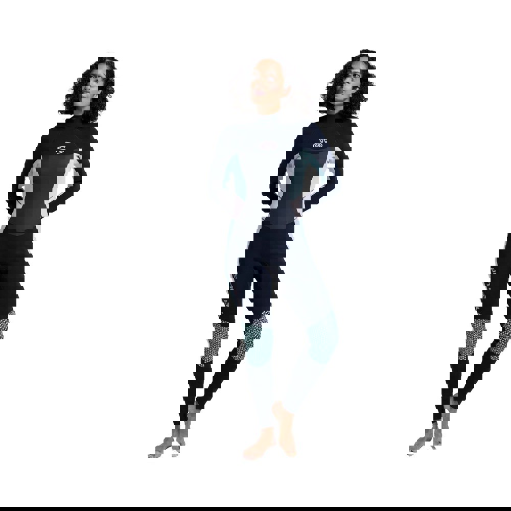 The Animal Kairi full wetsuit for women comes in black with a geometric star and logo design. It is made from DS foam neoprene with nylon and spandex, and uses comfort seams and detail seams. A back zip fastening provides a clean finish.