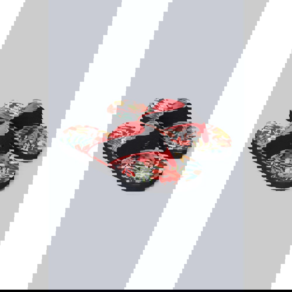 These women’s flip flops come in a bright orange finish with a leaf print and contrast detailing. The slip-on design keeps them simple to wear, while padded straps add extra structure across the foot. A logo detail completes the look.