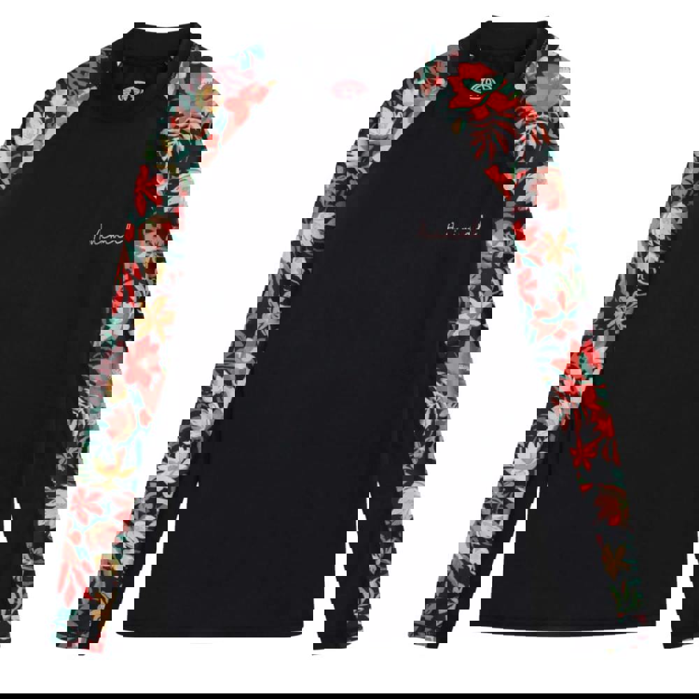 Animal Lillie printed panelled rash top in black. Made from 85% recycled polyester and 15% elastane, this long-sleeved style has a crew neck and a pull-over fastening for a clean, streamlined finish. The design combines printed flowers, leaves and logo detailing, with raglan sleeves and flat locked seams.