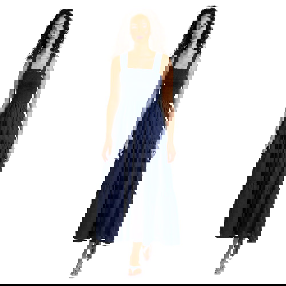 The Animal Mabel maxi dress in navy is made from 100% cotton with a lightweight feel. A plain finish keeps the look clean, while the tiered skirt adds shape through the length. The bodice is shirred with added stretch for a flexible fit.