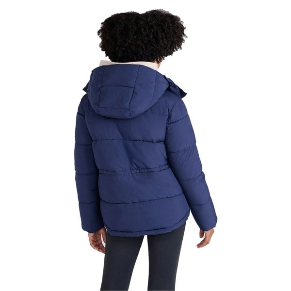 Animal Maeve puffer jacket in navy with a plain finish. Made from 100% polyester with microfibre filling and padded insulation. The hooded neckline and long sleeves create a covered silhouette suited to cooler conditions.