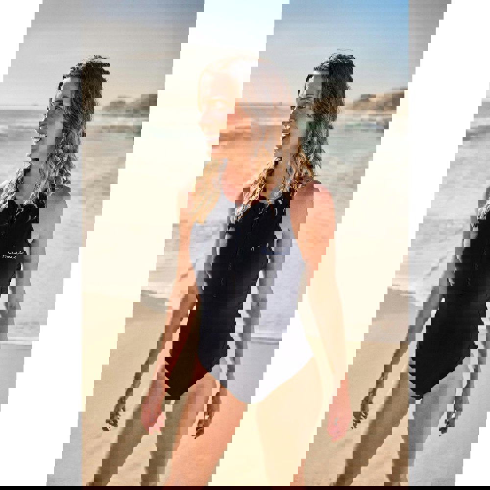 A crew neck and racerback shape create a streamlined silhouette, while the front zip fastening allows easy on and off. An adjustable detail supports a personalised feel, and the material includes stretch, quick-dry and chlorine-resistant technology. Sustainability information: REPREVE Our Ocean.