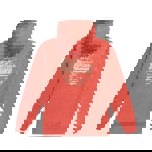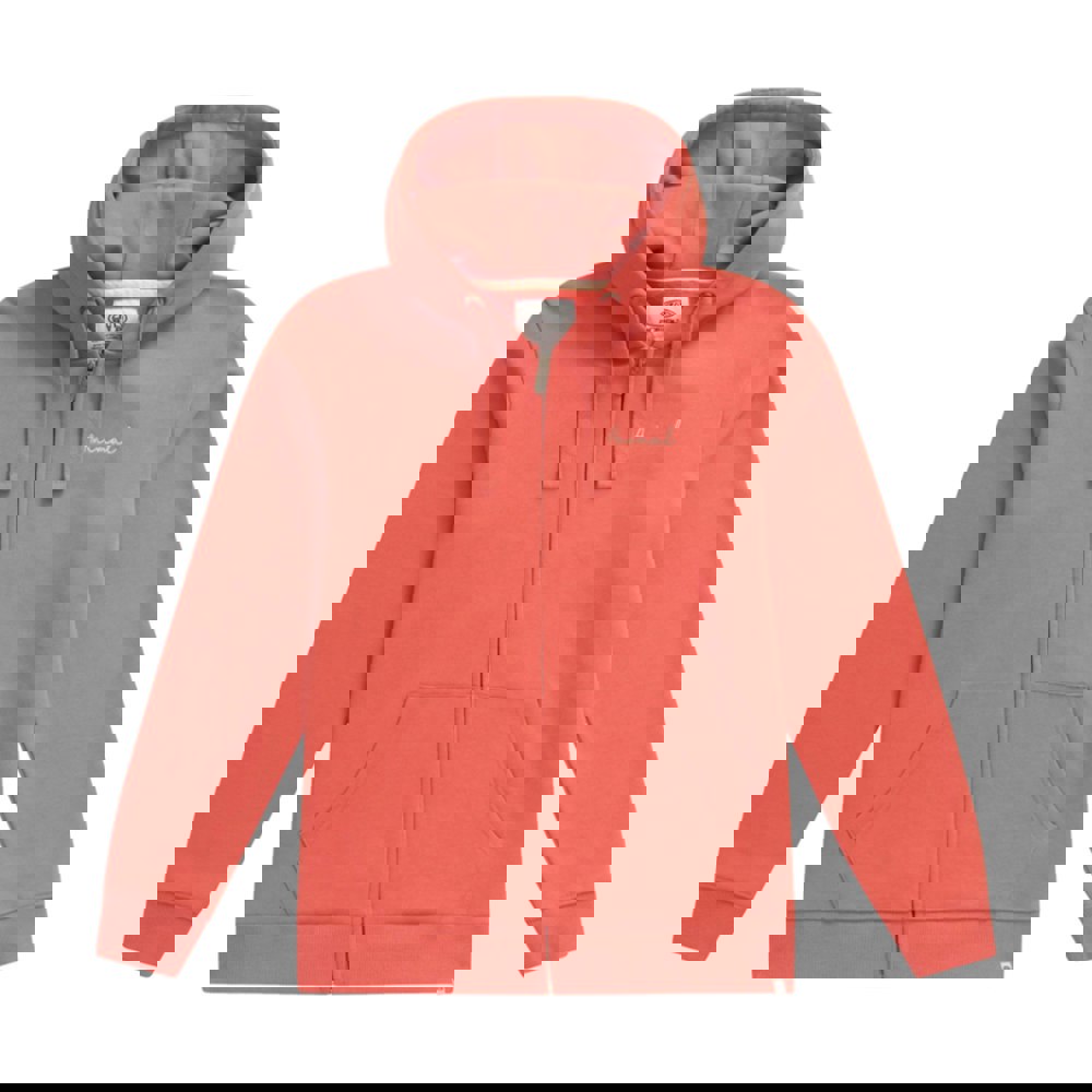 This full zip hoodie is made from organic cotton with added elastane. It comes in burnt orange and is finished with a back print combining graphic and text elements, including a mountain motif. A grown on hood with drawcord adds a practical finish, while the hooded neckline keeps the look classic and casual.
