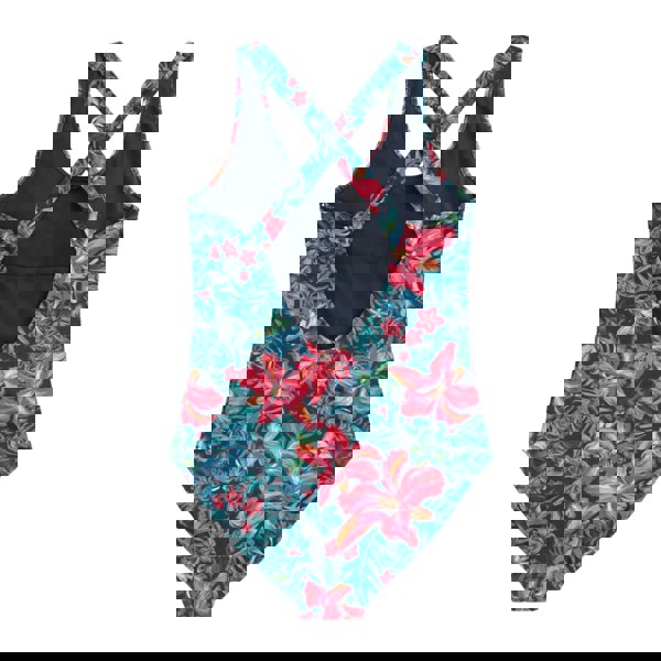 This one-piece swimsuit has a floral printed design in red and a cross-back style. It fastens with a pull-on construction and is finished with a round neckline. The shell combines elastane with recycled polyester, while the lining is made from recycled polyester.