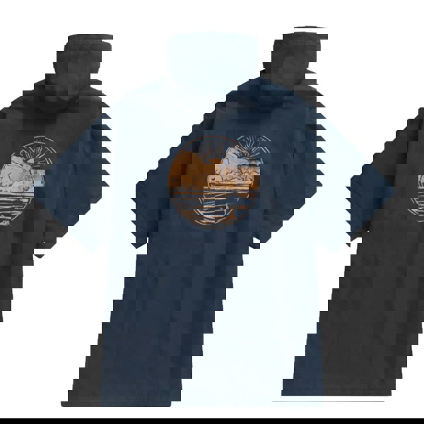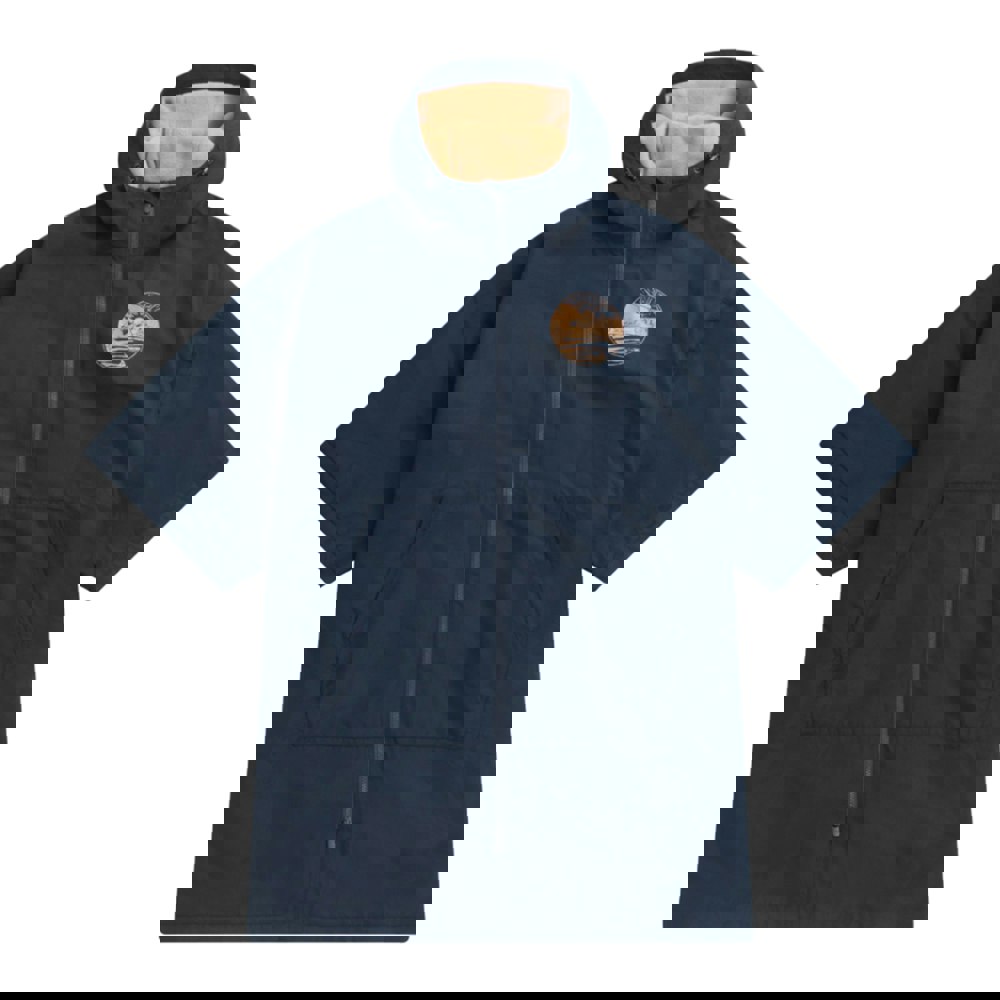 Made from 100% recycled polyester, this navy parka combines a fleece lining with a hooded neckline for practical coverage. The outer includes a DWR finish and is listed as breathable, durable, quick dry, water repellent, water resistant, waterproof and windproof, with taped seams for added protection.