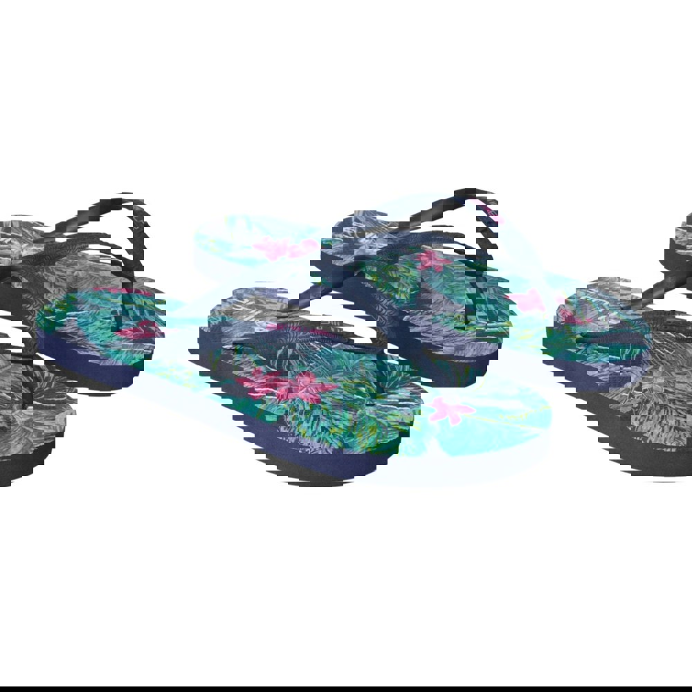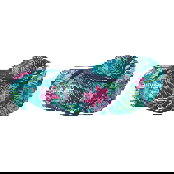 Add a bold finish to warm-weather outfits with these Oceana printed flip flops. The slip-on design keeps them easy to wear, while the flat heel offers a simple, low-profile shape. A tropical printed look is paired with logo detailing for a distinctive finish in pink.