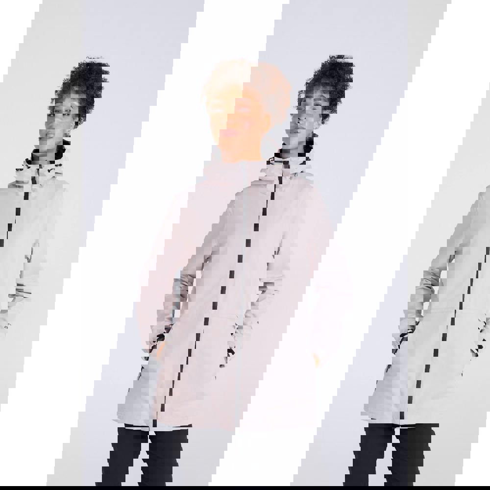 This women’s Pace packable waterproof jacket comes in beige with a plain finish and logo detail. The outer is made from 55% recycled polyester and 45% polyester, with a lining in 100% recycled polyester. A hooded neckline includes a grown-on hood with a toggle adjuster, while extra-long sleeves are finished with hook and loop strap cuffs.