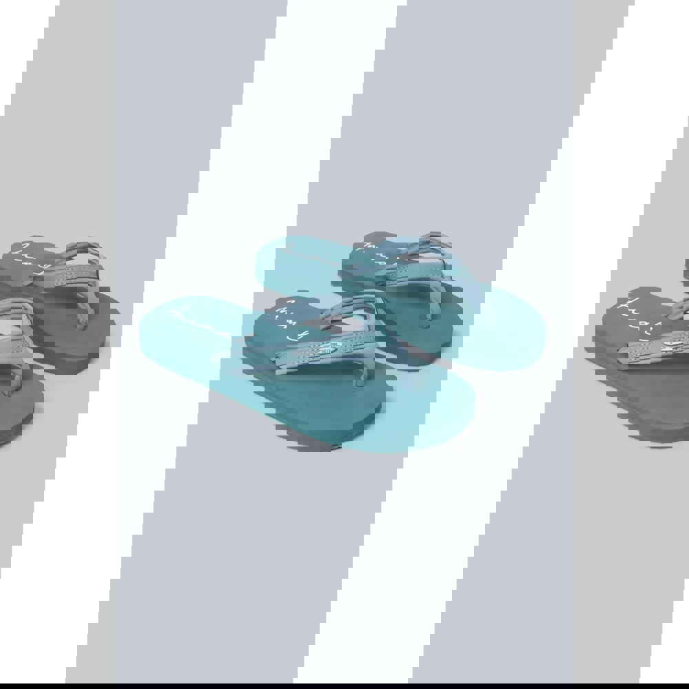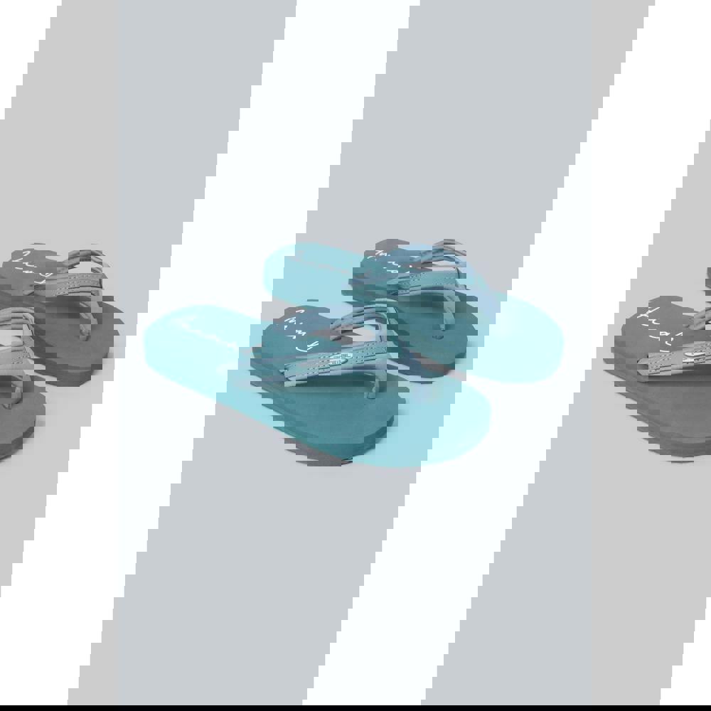 These flip flops come in a pale green finish with a slip-on design and open toe styling. A toe post and padded straps complete the upper, while a flat heel keeps the profile simple. Logo detailing adds a branded touch.