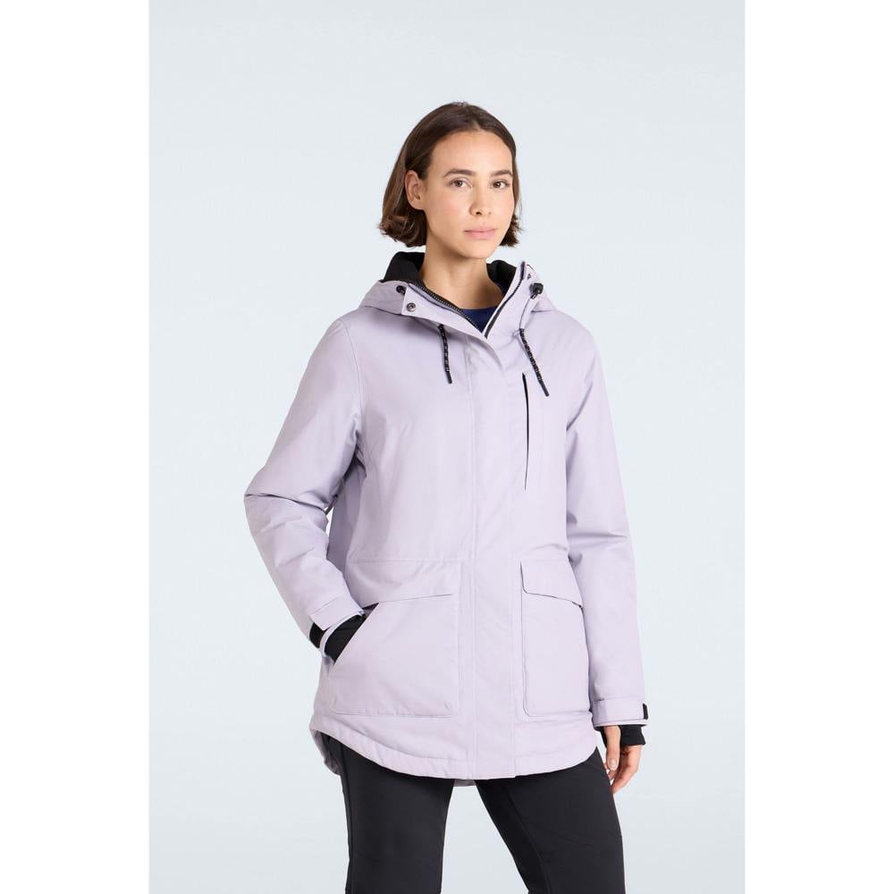 The Animal Womens Tignes Ski Jacket in light purple is made from 100% recycled polyester and finished with a logo and back print. It combines a high-neck shape with a grown-on hood, complete with an adjustable drawstring for a secure feel.