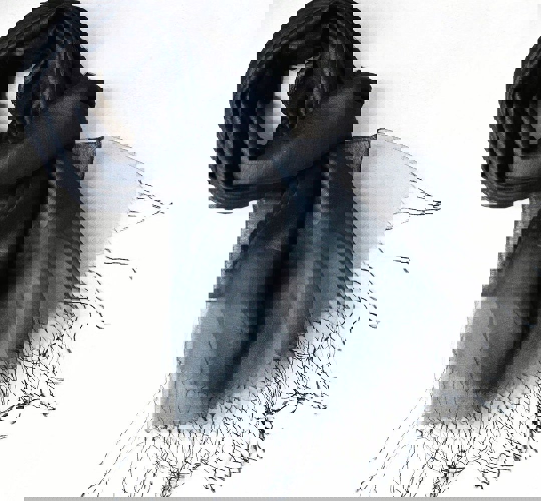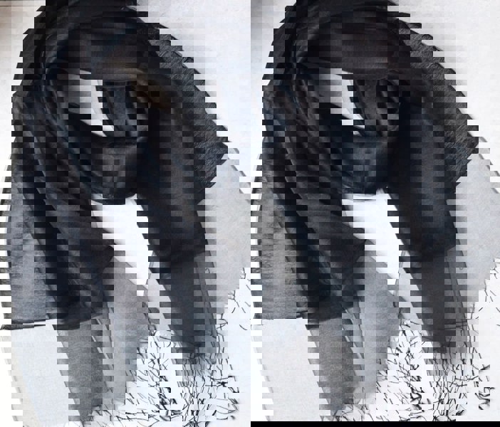 A beautifully feminine, black, double layered silk/viscose tasselled scarf.
