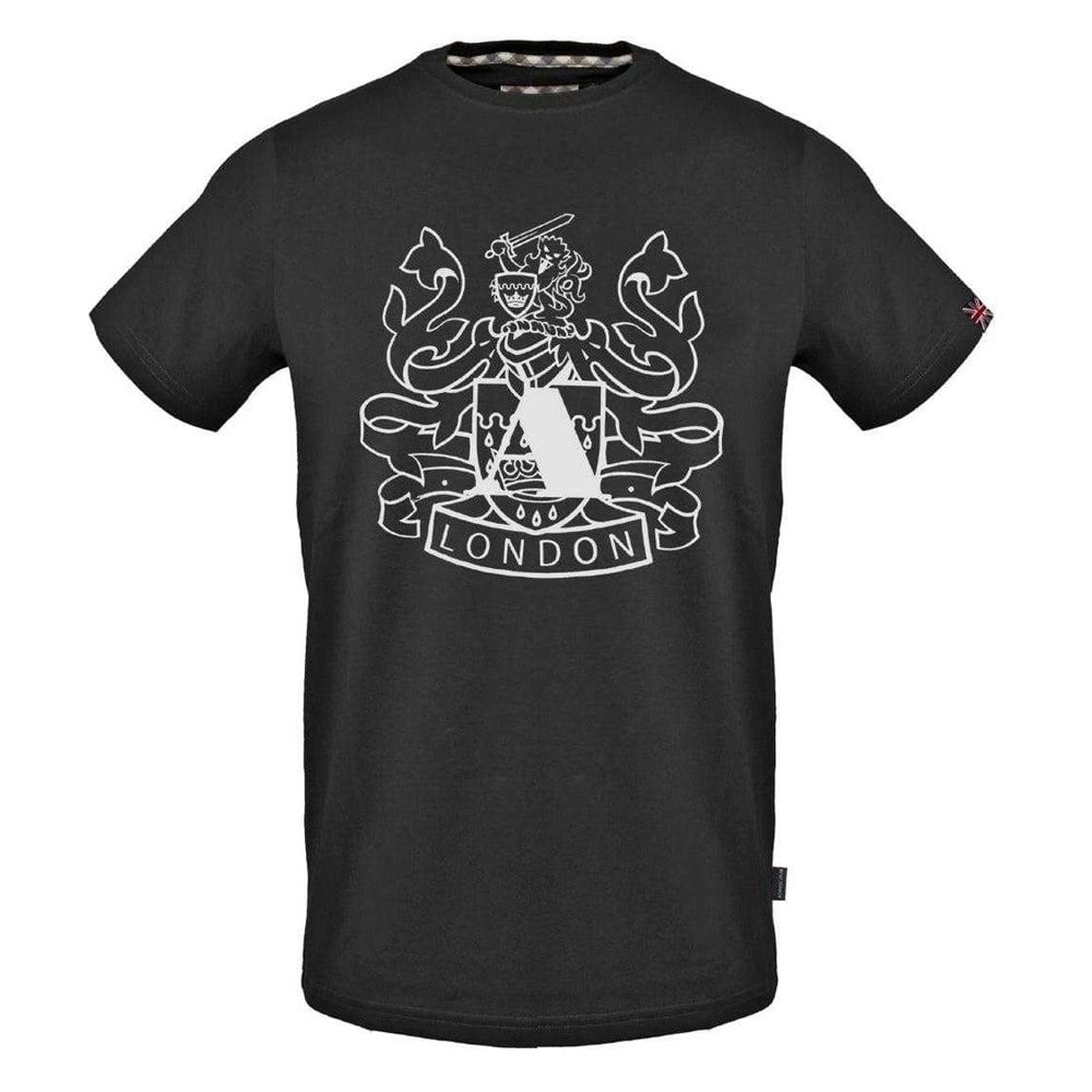 This men’s Aldis T-shirt from Aquascutum is made from 100% cotton and finished in black. The design includes a printed shield logo, paired with a classic crew neckline and short sleeves for a clean, casual look.