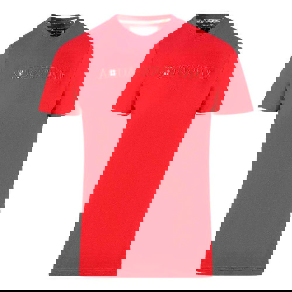 This short-sleeved T-shirt is made from 100% cotton and finished in red. It has a crew neck and a slim fit, with an embossed logo and printed detailing. The design includes a Union Jack motif.