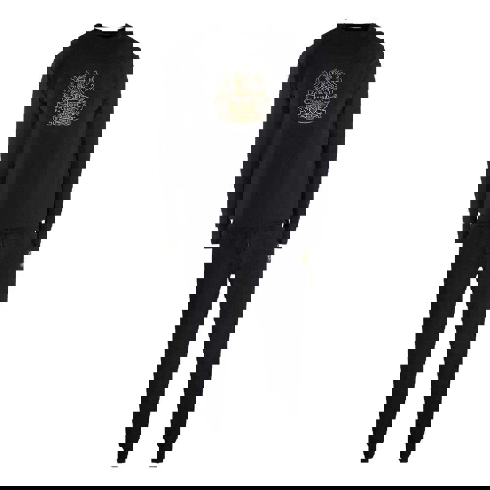 The sweatshirt is long-sleeved with raglan sleeves and a crew neckline, finished with ribbed cuffs and a ribbed hem. The pants have an elasticated waist with a drawstring and include practical pocketing for everyday use. A logo design completes the set.