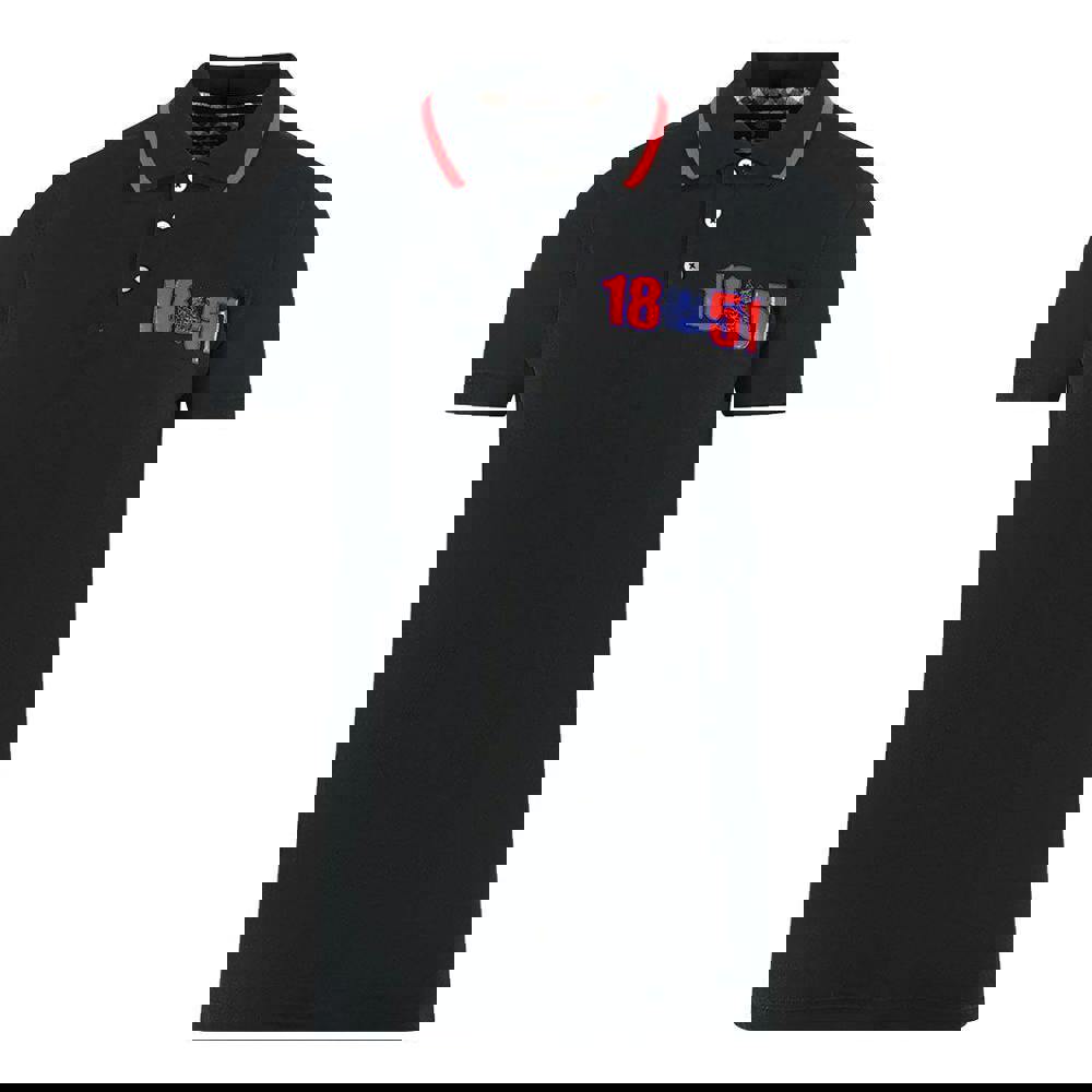 This polo shirt from Aquascutum Mens London 1851 is made from 100% cotton and finished in black. It has short sleeves and a turn-down collar, with a three-button placket for a clean, traditional polo look. A printed number design adds a graphic detail while keeping the overall style straightforward.