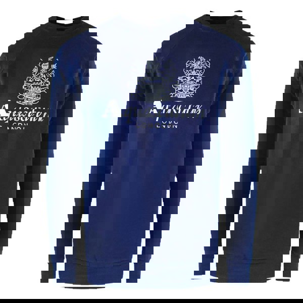 This tracksuit set includes one top and one pair of bottoms, finished in navy blue with a printed design. Made from 95% cotton and 5% elastane, it has a soft-touch feel and a pull-on construction for straightforward wear.
