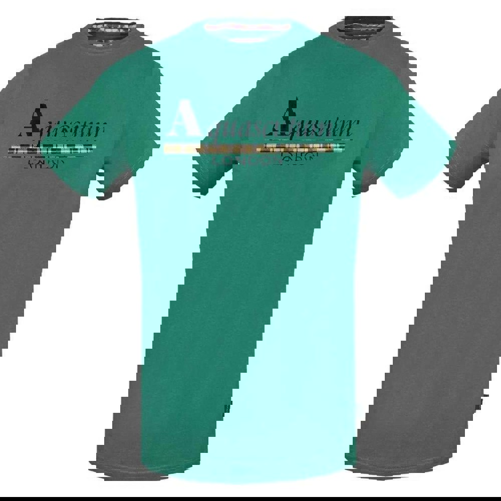 This men’s T-shirt from Aquascutum comes in green with a crew neck and short sleeves. It is made from a cotton-rich blend with added elastane and uses stretch fabric technology. The design combines checked, stripe and printed elements, finished with a logo detail. A regular fit keeps the silhouette clean and easy to wear.