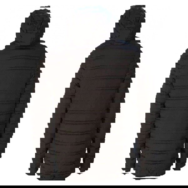 This unisex adult padded jacket comes in black with a lightweight construction and a logo design. It is made from 100% polyester and uses PrimaLoft tech performance fabric technology. A hooded neckline and long sleeves create a practical outer layer for active wear.