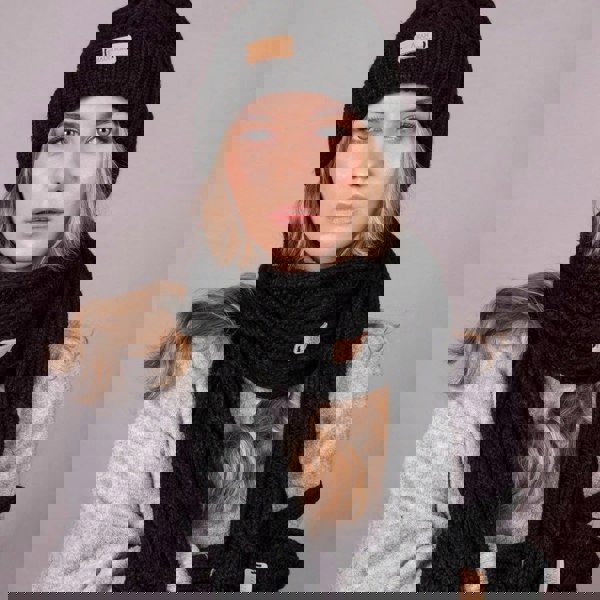 With its generous length, this versatile scarf can be styled in various ways to suit your preference. Wrap it snugly around your neck and tie the pom poms under your chin for a classic look, or let the pom poms hang loose for a more relaxed and playful style. Whether you're braving the cold outdoors or adding a cozy layer to your indoor outfit, this Aran cable pom pom scarf is a must-have accessory that combines style and functionality.