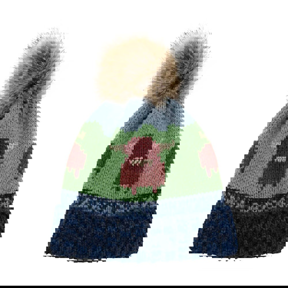 Indulge in the luxurious softness of our Aran Knitted Highland Cow Beanie, created with a soft and cozy 3GG knit. This ensures not only warmth but also a comfortable feel against your skin.