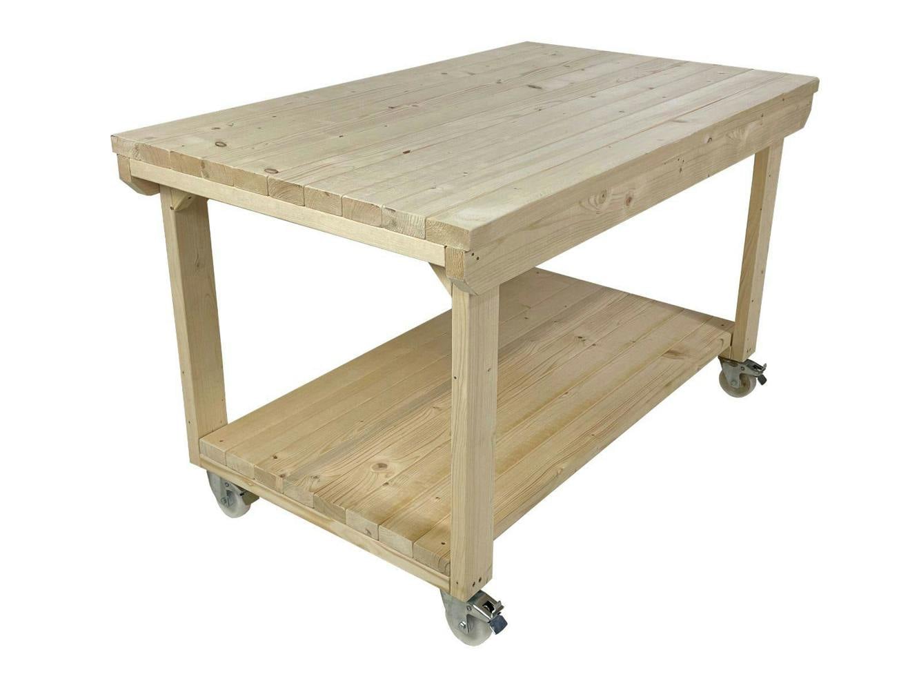 The Rotem Wooden Kiln-Dry Workbench is a robust and versatile addition to any workshop or garage. Handcrafted in the UK, this workbench is constructed from construction-grade CLS C16 kiln-dried timber, ensuring exceptional strength and durability. Available in widths ranging from 1200mm to 2400mm (4ft to 8ft) and depths of 900mm or 1200mm (3ft or 4ft), it accommodates various workspace requirements. The standard height is 900mm (3ft), providing a comfortable working level. For enhanced mobility, the workbench is equipped with integrated swivel heavy-duty wheels with brake castors (100mm, each supporting up to 125kg), allowing for easy movement and secure positioning within your workspace. With a weight capacity of up to 850kg (500kg with wheels), it is designed to handle a wide range of projects. Customization options are available upon request to fit your specific needs. Each bench is supplied in a knockdown form for straightforward on-site assembly, requiring only a screwdriver. Comprehensive assembly instructions are included for your convenience.