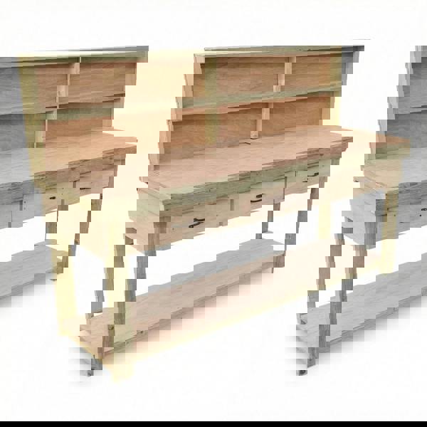 Introducing our Wooden Eucalyptus hardwood workbench tool cabinet with drawers featuring a premium 18mm eucalyptus hardwood top. Eucalyptus wood is renowned for its exceptional durability and natural resistance to rot and decay, making it an excellent choice for a long-lasting work surface. This workbench offers ample storage with multiple drawers and a base shelf, providing secure and organized space for your tools and materials. Handcrafted in the UK, it combines functionality with superior craftsmanship, ensuring a reliable addition to your workspace.
