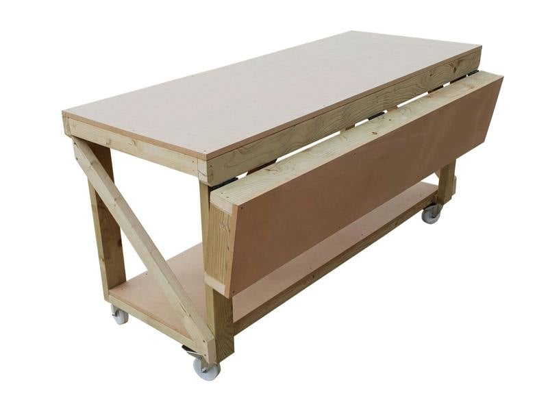 The Wooden MDF Top Workbench with Extendable Working Surface is a versatile and robust addition to any workshop or garage. Handcrafted in the UK, this workbench is constructed from high-quality construction-grade CLS C16 kiln-dried timber, ensuring exceptional strength and durability. The smooth 18mm MDF ply sheet top provides a reliable surface for various projects, while the innovative design allows the workbench depth to extend from 700mm to 1000mm (2. 3ft to 3ft) in just 30 seconds, offering additional workspace when needed. Equipped with integrated swivel heavy-duty wheels with brake castors (100mm, each supporting up to 125kg), this workbench ensures easy mobility and secure positioning within your workspace. With a weight capacity of up to 650kg (500kg with wheels option), it is designed to handle a wide range of projects. Customization options are available upon request to fit your specific needs. Each bench is supplied in a knockdown form for straightforward on-site assembly, requiring only a screwdriver. Comprehensive assembly instructions are included for your convenience.